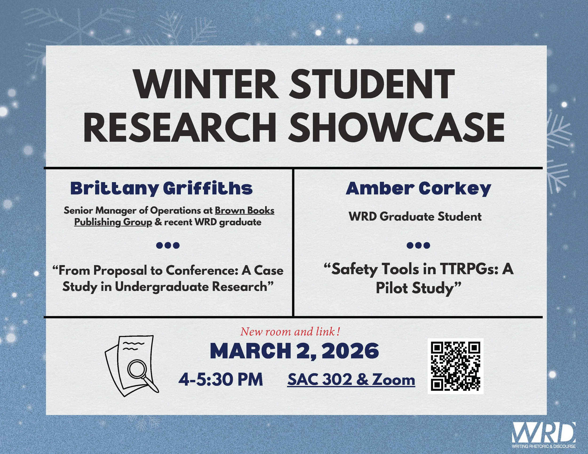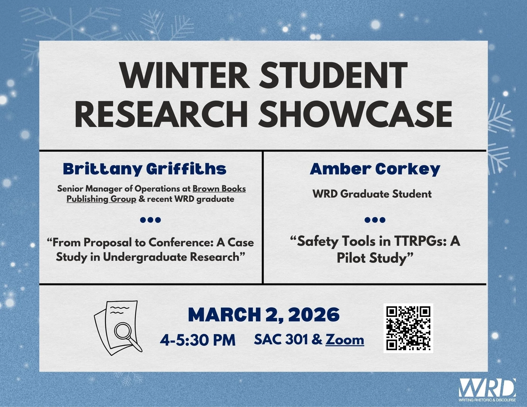 Please join us for an upcoming Writing, Rhetoric and Discourse Department event featuring two of our outstanding students as they share their recent self-designed research projects. We hope you’ll also share this information with friends, students, and colleagues.
