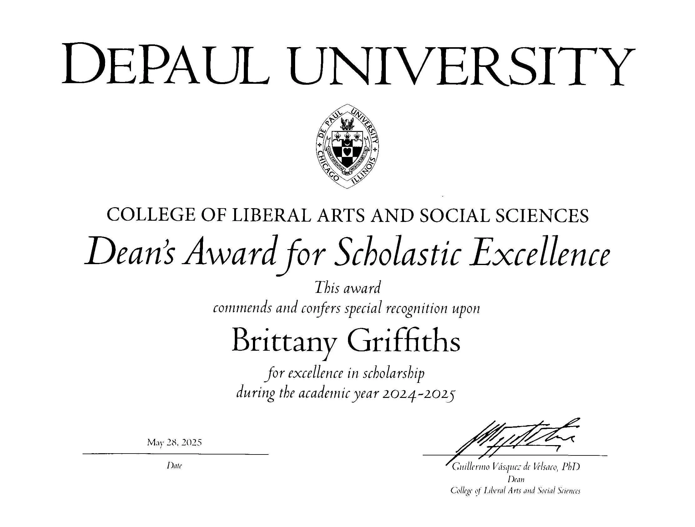 May 2025Awarded in recognition of academic achievement for maintaining a GPA of 3.7 or higher. Presented at the Annual Honors Convocation during the recipient’s senior year.